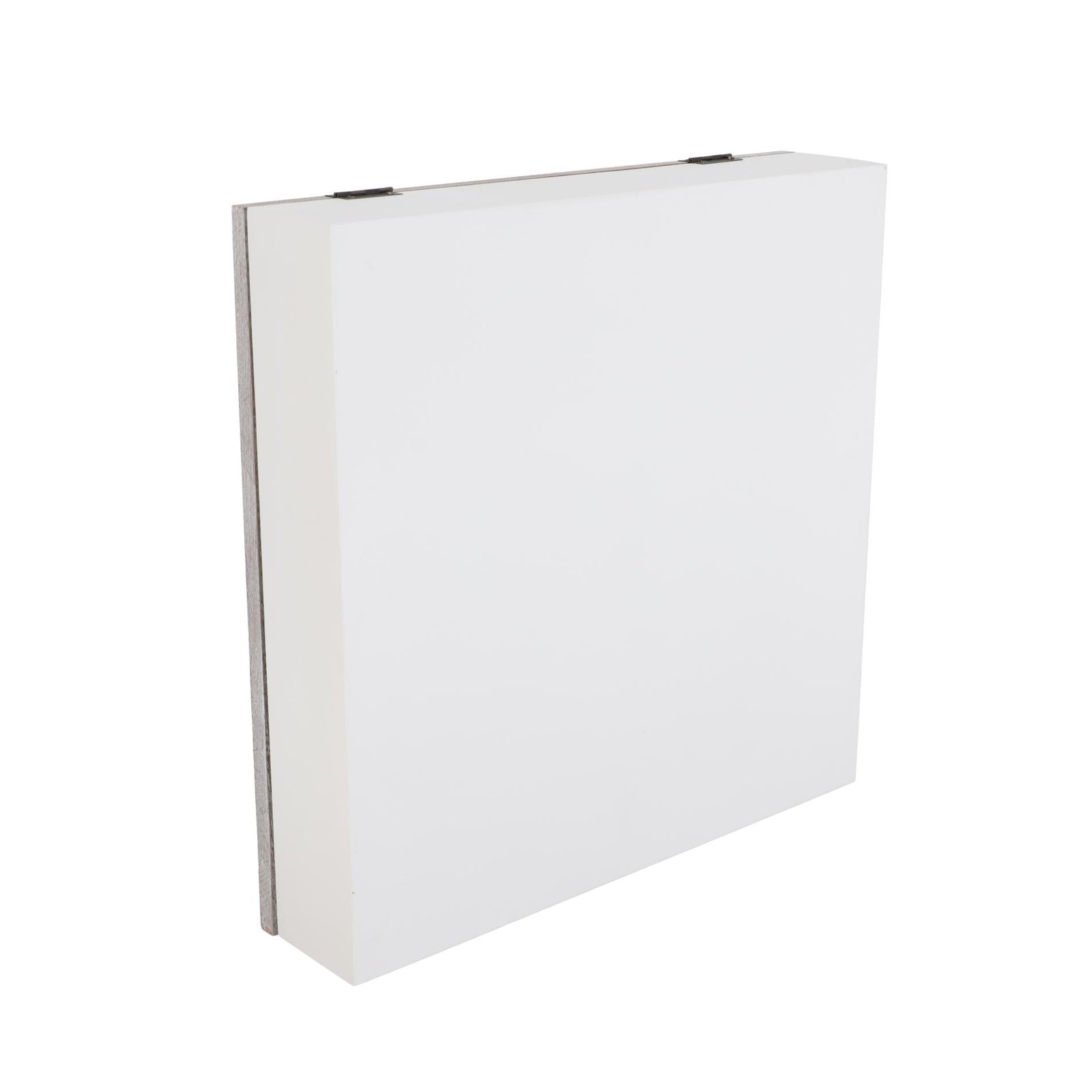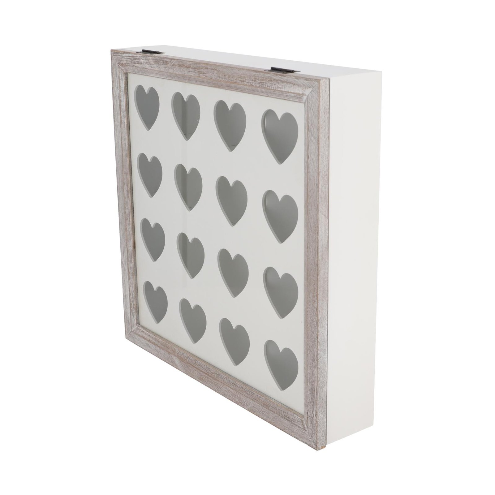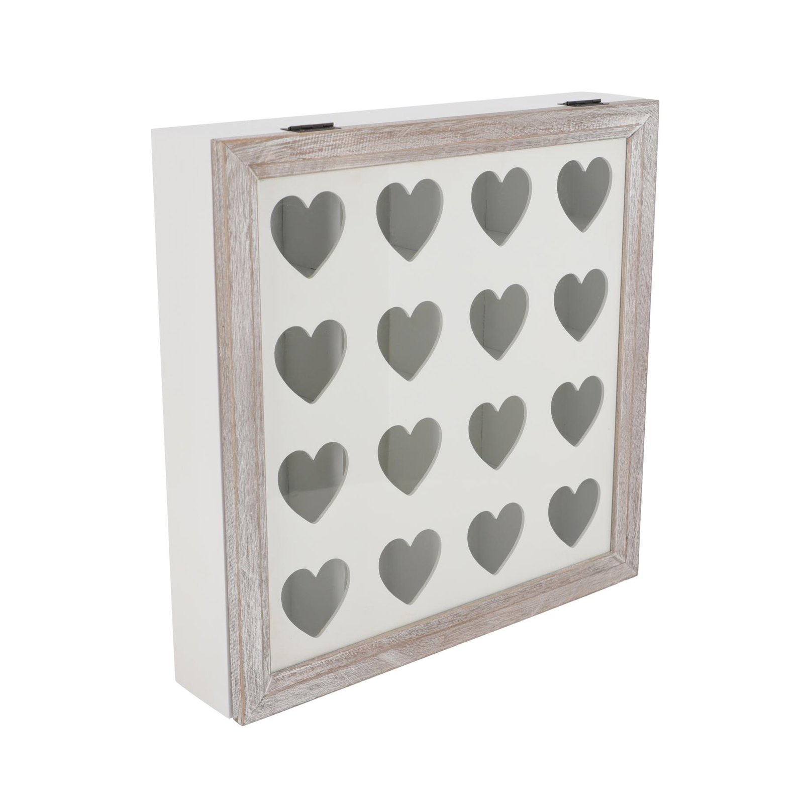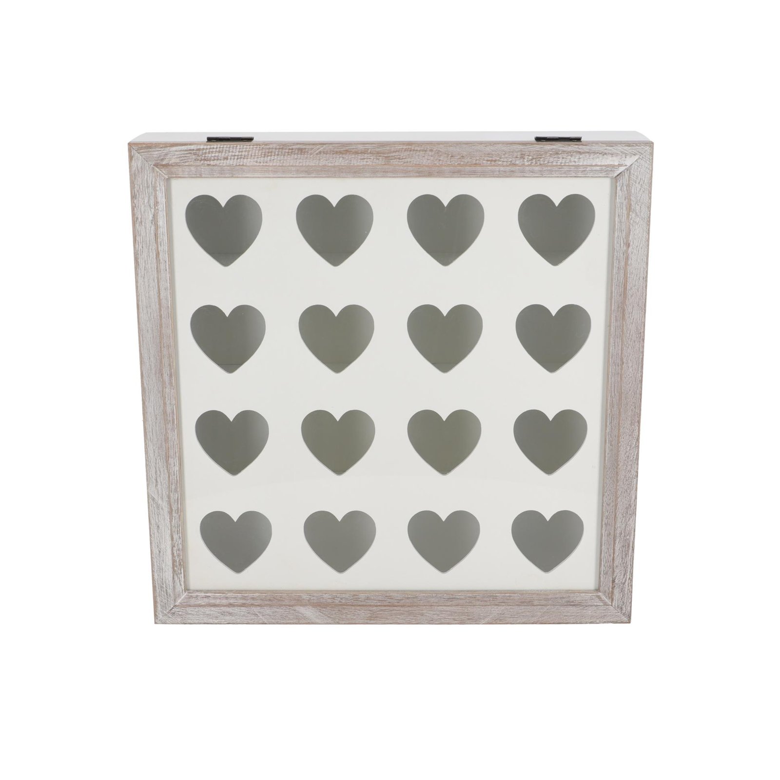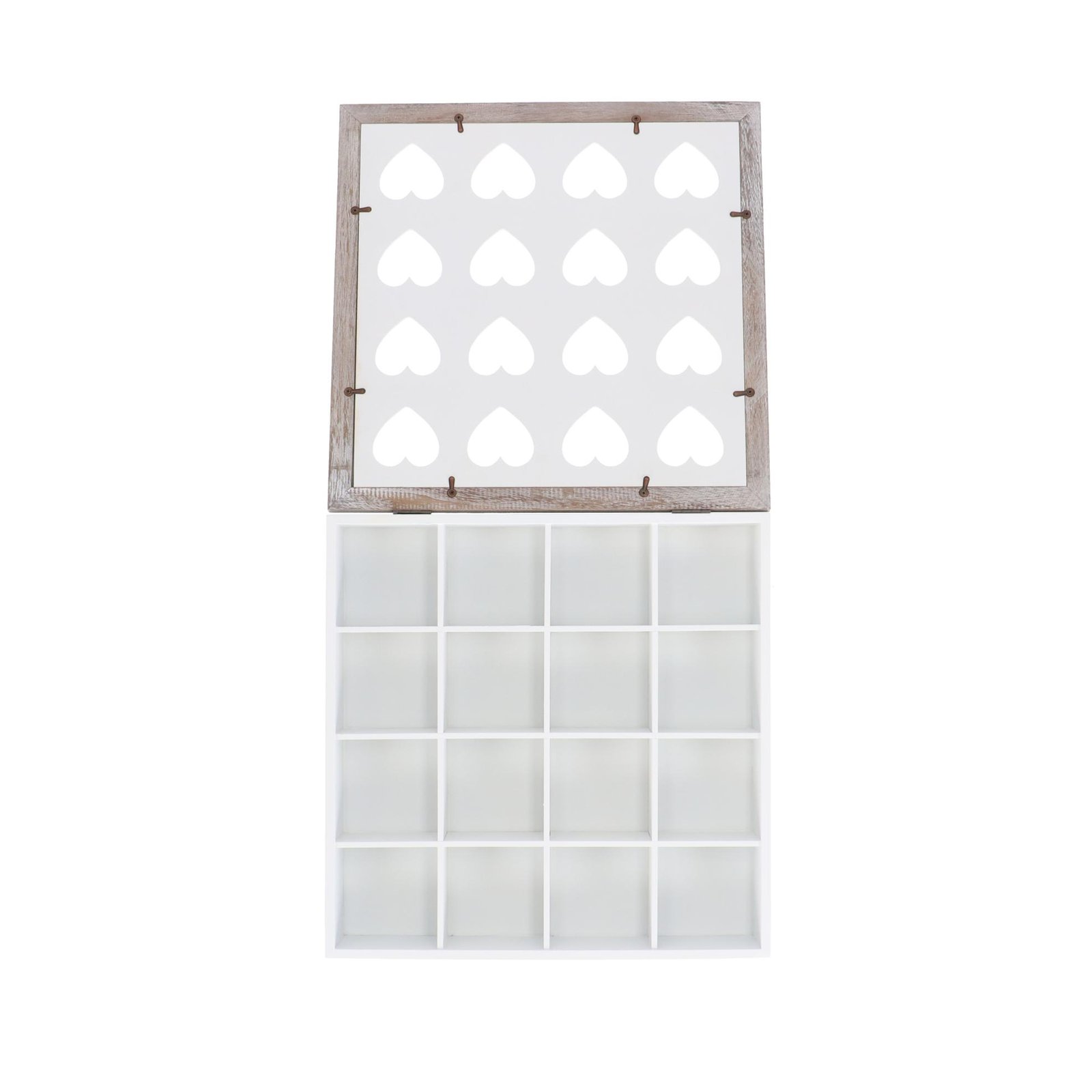 Scatola portabustine da tè in legno di colore bianco e coperchio in legno naturale e vetro con cuori. Dotata di 16 scomparti portabustine.